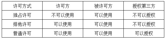 在各国的法律规定中,专利许可一般被规定分为以下几类:独占许可(Exclusive License)、排他许可(Sole License)、普通许可(Simple License)、分许可证(Sub License)、强制许可(Compulsory License)、交叉许可(Cross License)等。其中常见的三种许可方式的对比如下表所示:
